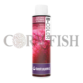 ReeFlowers B-Colour حاوی عناصر و رنگ دانه های افزایش دهنده ی رنگ مرجان هاست (به ویژه صورتی، بنفش و آبی). این محلول فعالیت های حیاتی آبزیان آکواریومی را سرعت می بخشد، به پایداری pH کمک می کند، سرعت رشد را افزایش می دهد و به داشتن آکواریومی سالم تر کمک می کند.